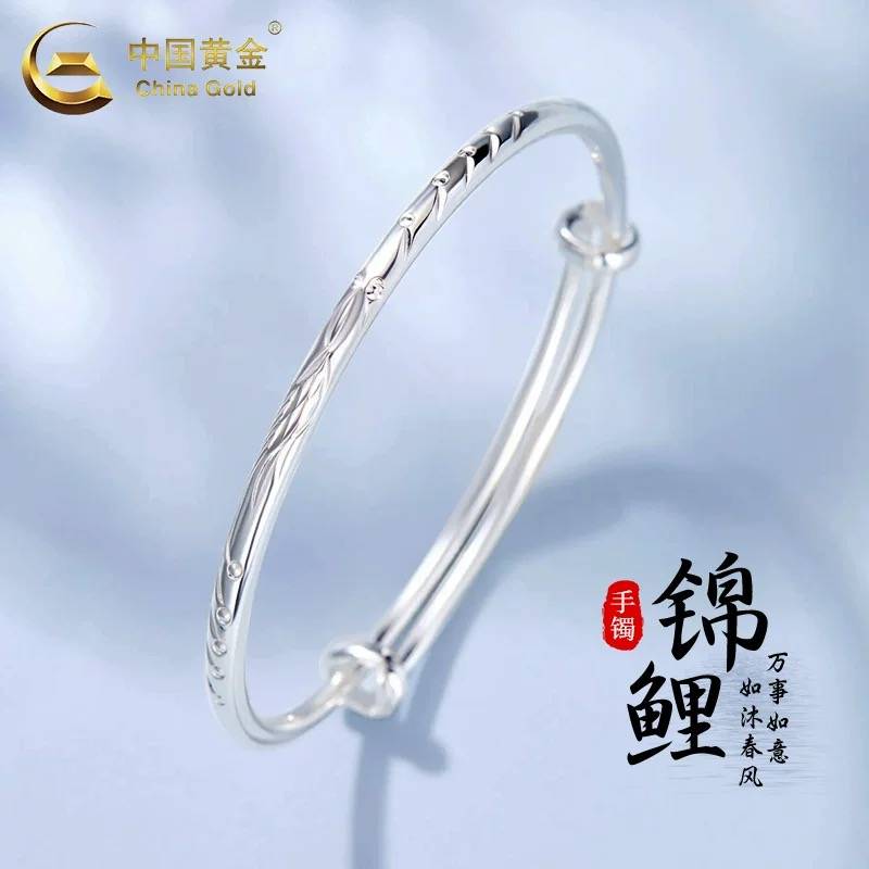 中国黄金足银上岸好运锦鲤手镯女新款纯银步离镯子生日礼物送女友