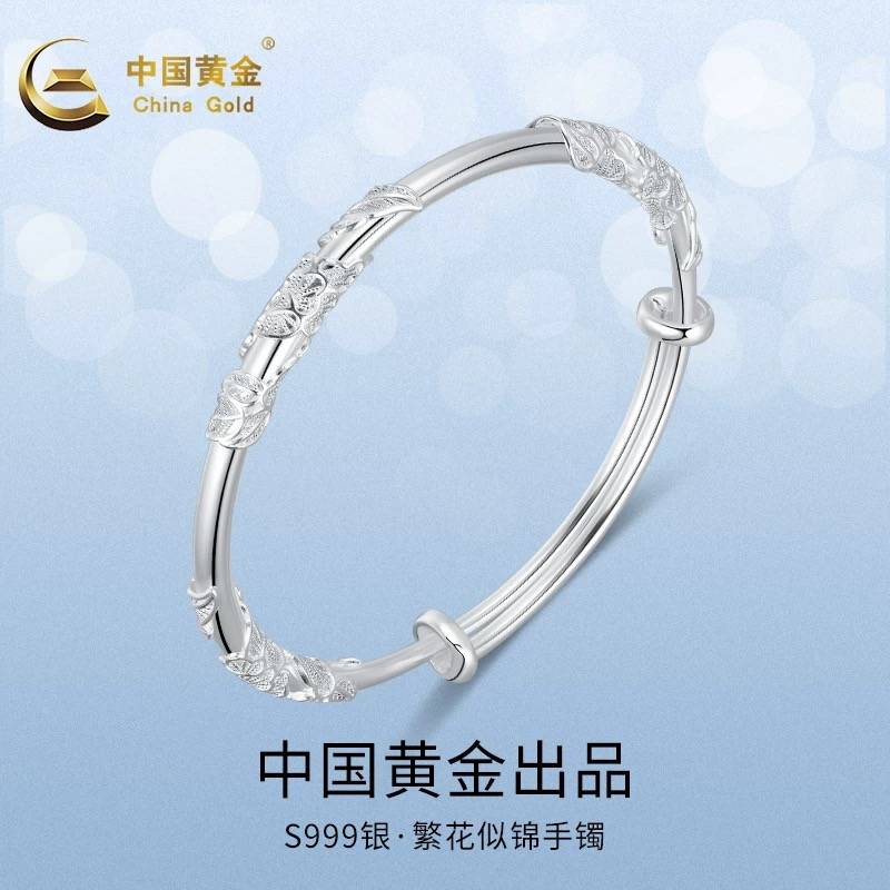 中国黄金繁花似锦银手镯女纯银足银999镯子送女友生日情人节礼物E
