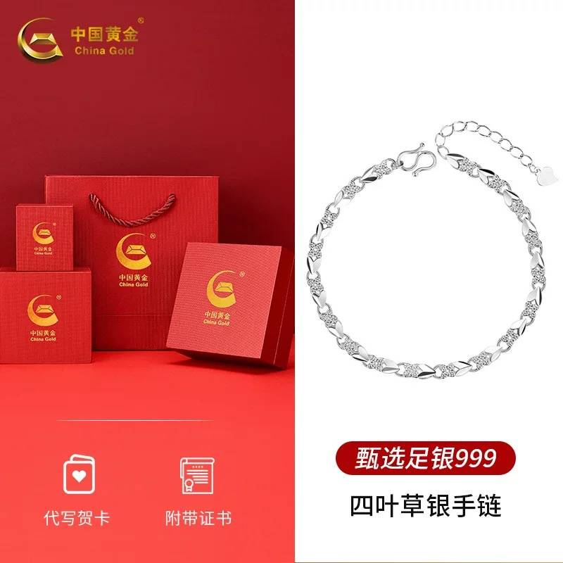 中国黄金999纯银四叶草银手链女生足银送女友生日三八妇女节礼物s