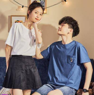 2021夏季情侣套装男女宽松圆领刺锈短袖T恤牛仔中裤半身短裙