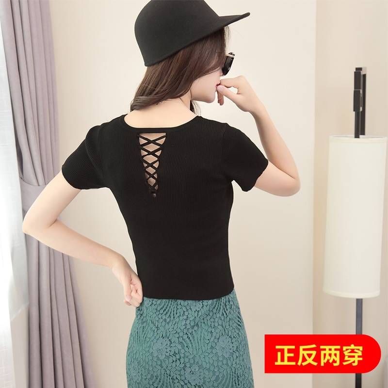 2018新款夏季针织短袖t恤心机婊冰丝镂空露背紧身上衣女显瘦韩版