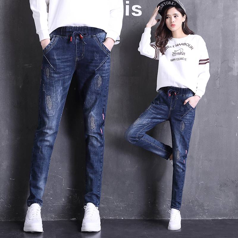 松紧腰牛仔裤宽松女韩版学生秋季2017新款bf大码胖mm百搭哈伦长裤