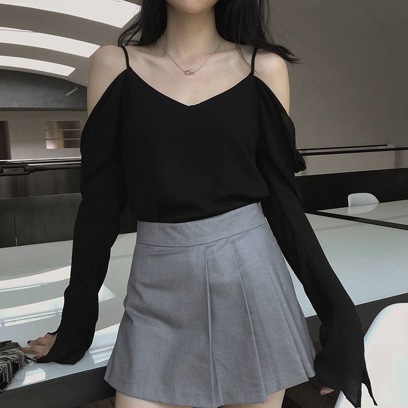 edacity 雪纺衫女韩风漏肩黑色长袖性感吊带港味chic早秋上衣慵懒