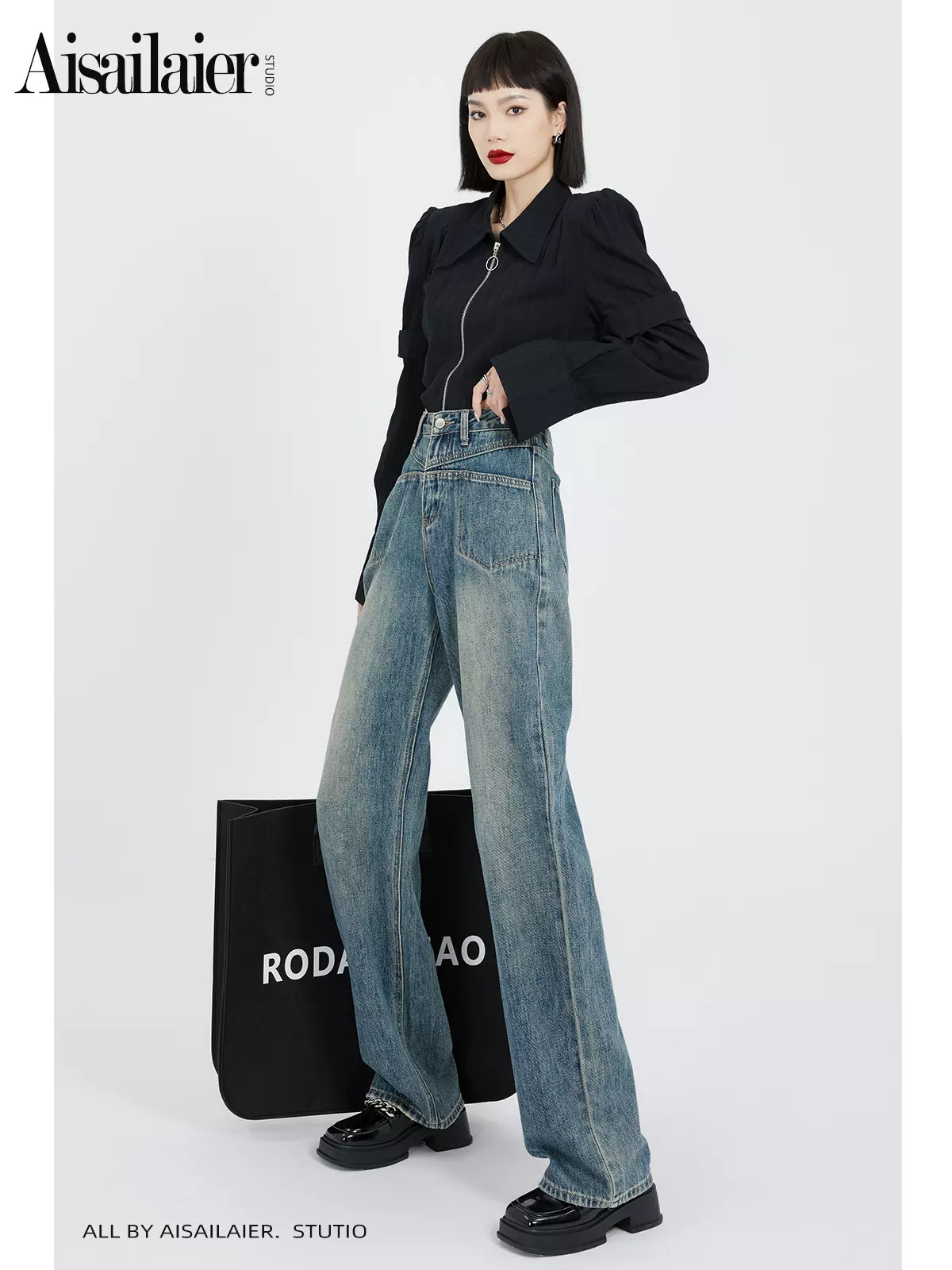 秋冬加绒复古阔腿牛仔裤女春秋2022年新款高腰宽松垂感直筒拖
