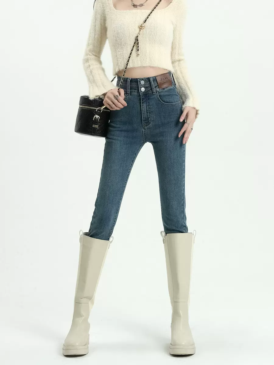 高腰小脚牛仔裤女2022年秋冬新款加绒修身显瘦紧身配靴子铅笔裤