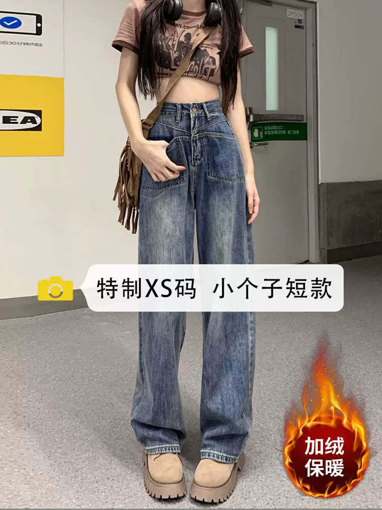 秋冬装小个子加绒加厚牛仔拖地裤子垂感直筒牛仔裤女阔腿裤145