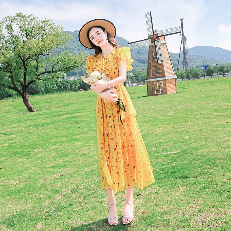 黄色碎花连衣裙女夏2020新款夏季长款收腰显瘦气质荷叶边长裙过膝
