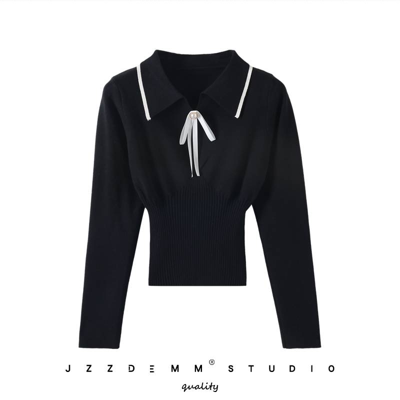 蝴蝶结饰品针织打底衫秋冬新款时尚气质polo衫收腰修身套头上衣女
