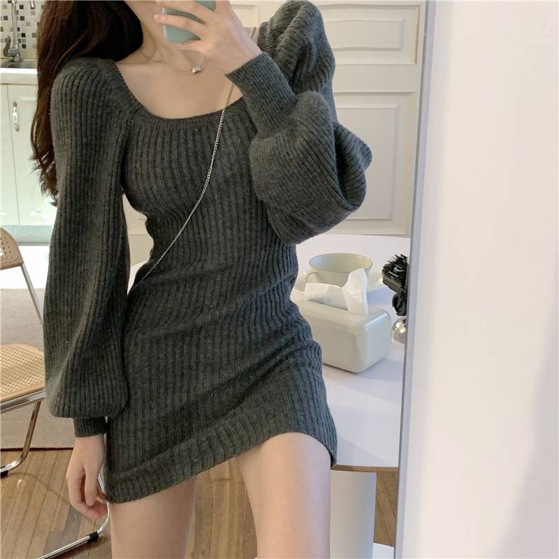 黑色小个子针织打底连衣裙女装秋冬2021新款方领收腰藏肉包臀裙子