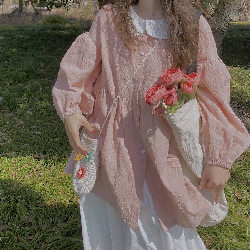 夏季套装女学生宽松拼接娃娃领长袖衬衫+中长款白色半身裙两件套