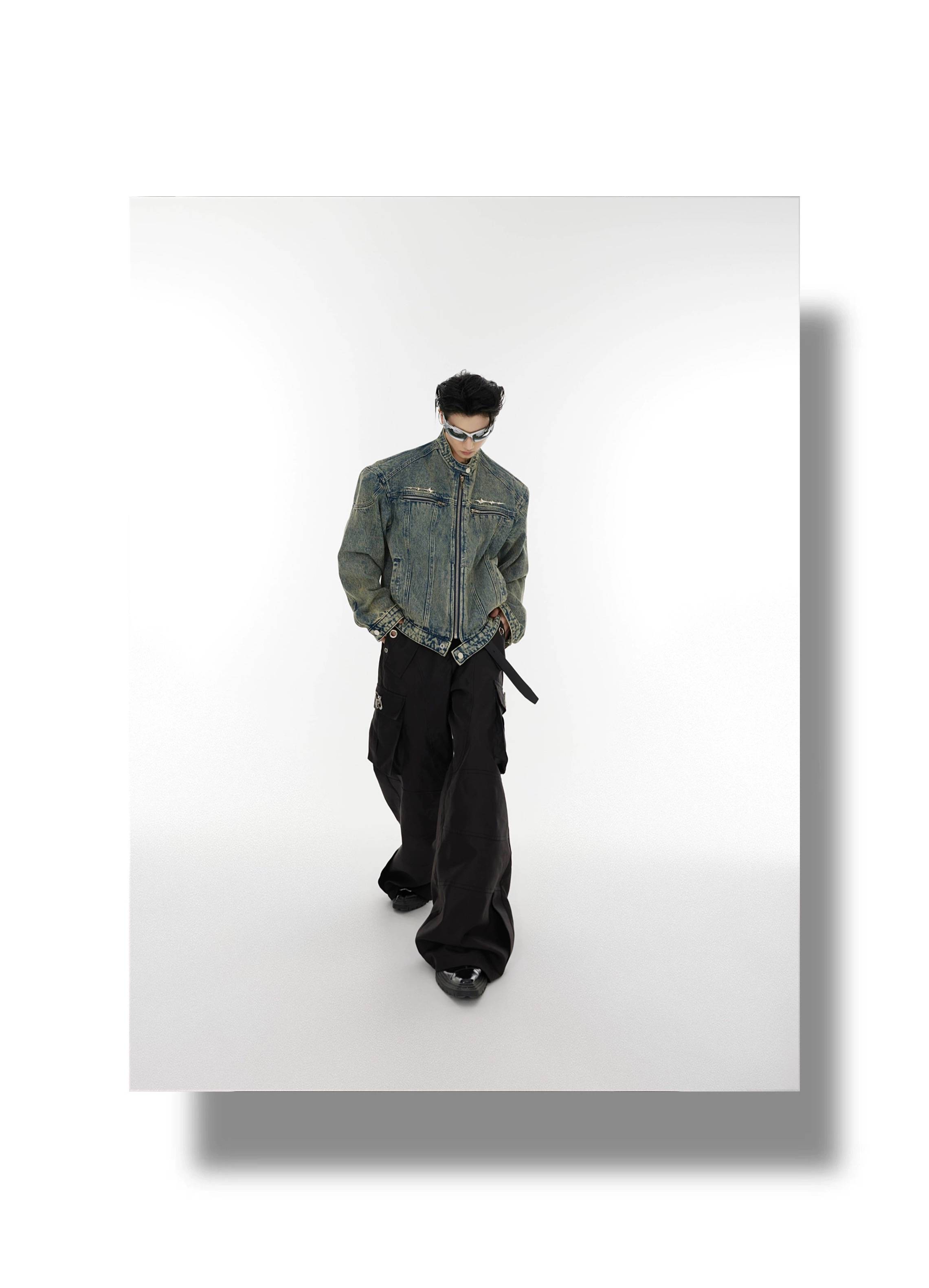 CulturE24s早春复古做旧水洗垫肩短款牛仔外套金属设计无领夹克男 247.00 已售:0件
