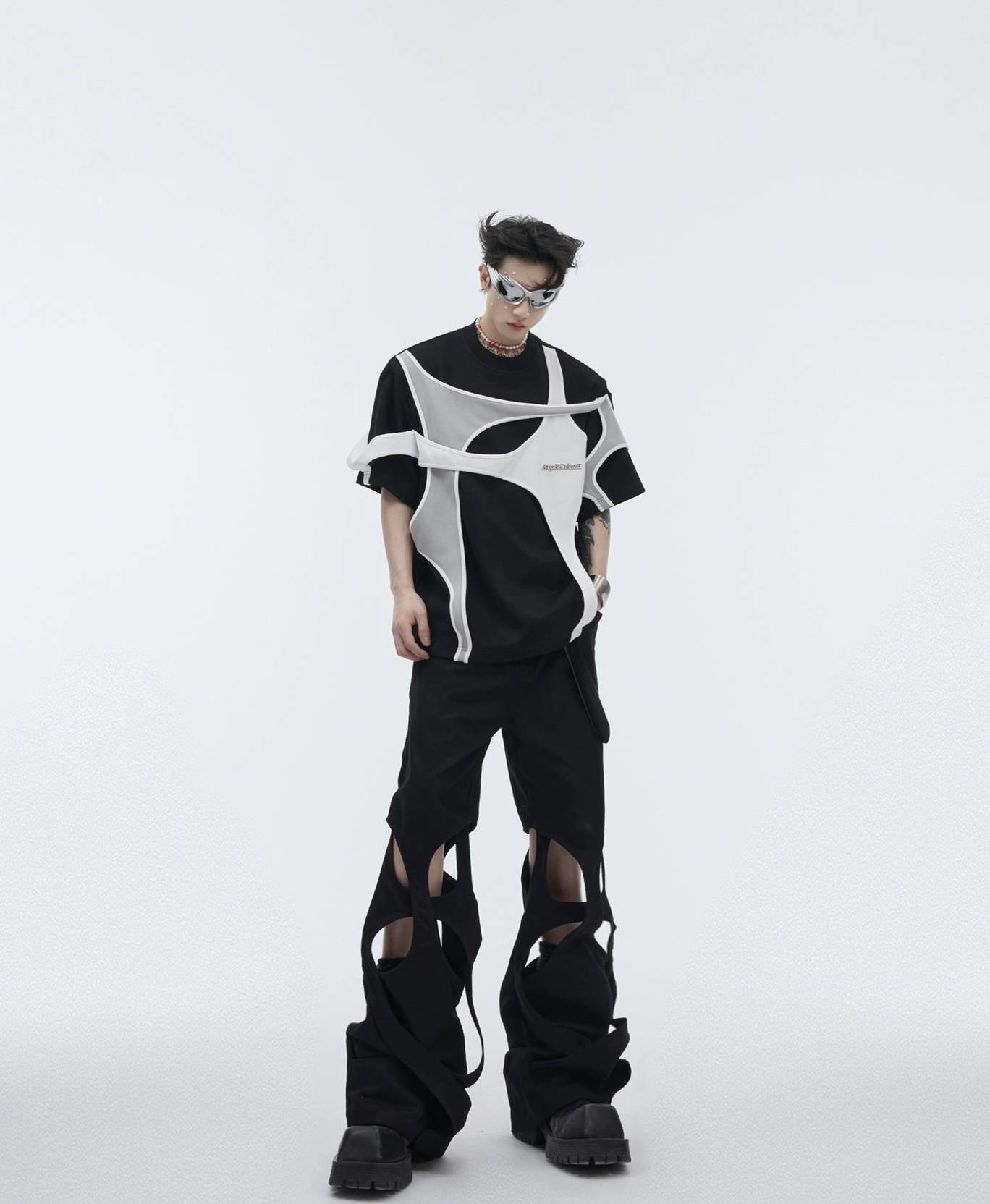 CulturE夏季小众解构双层拼接设计感垫肩短袖绑带撞色宽松重磅T恤 139.90 已售:0件