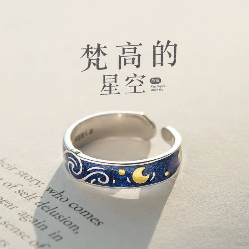 原创梵高星空银戒指女日韩纯银个性冷淡风潮人学生食指戒尾戒