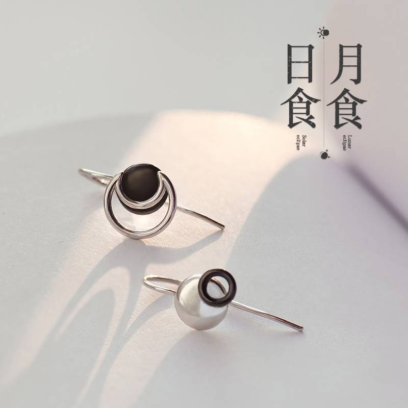 原创日食月食耳钉女纯银韩国学生防过敏个性耳环简约气质耳钩