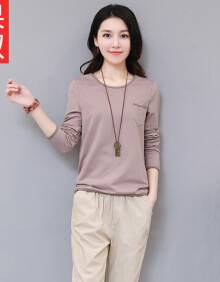 早秋秋季棉长袖t恤女士大码女装宽松上衣纯色打底衫