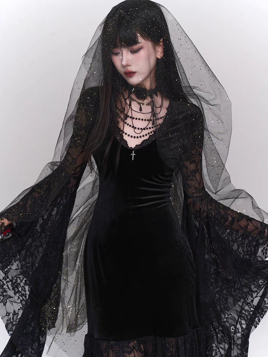 暗黑哥特蕾丝万圣节圣诞cos性感辣妹修身绑带收腰拖摆丝绒连衣裙