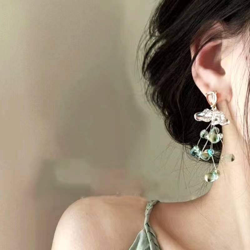 新款超仙法式绿色复古水晶流苏花朵耳环女高级感小众设计ins耳钉