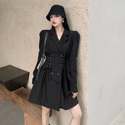 赫本气质炸街收腰抽绳双排扣翻领黑色西装裙显瘦白色小个子连衣裙