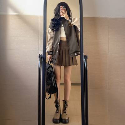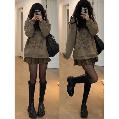 秋冬新款网红小个子少女穿搭咖色字母卫衣百褶短裙学院风两件套装