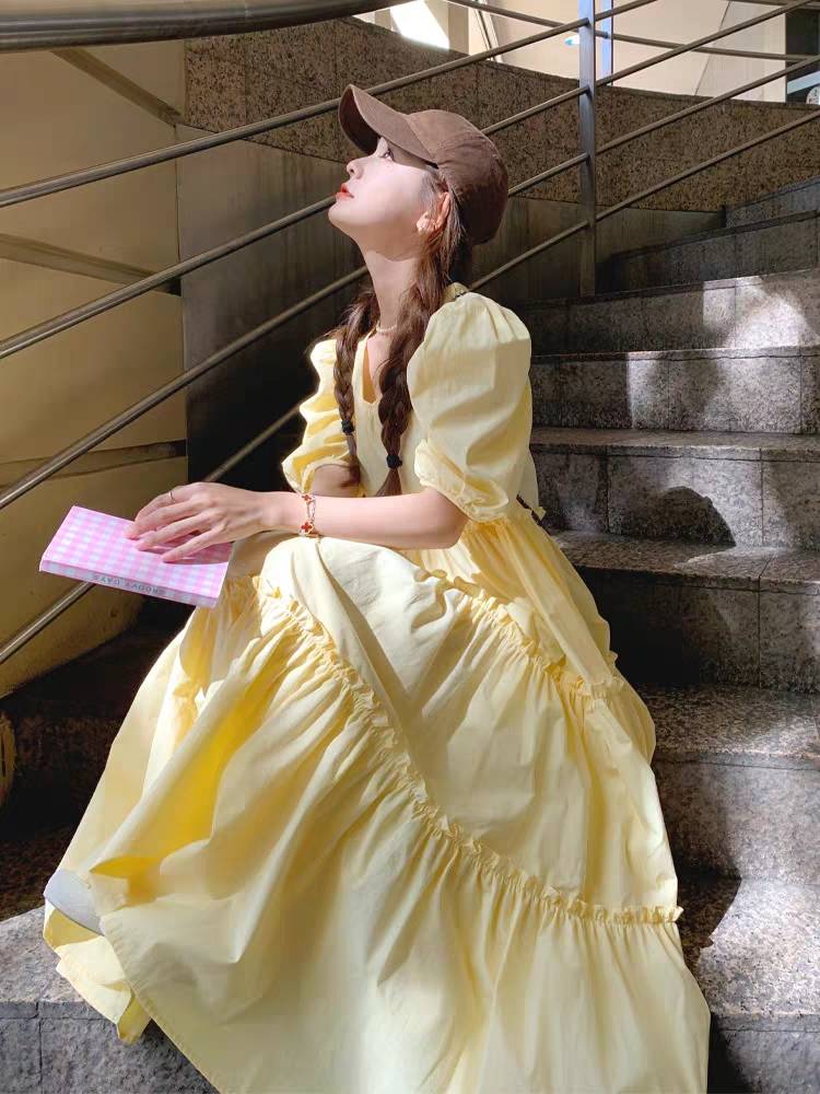 淡黄色法式温柔风V领连衣裙女ins超仙森系别致绝美高级感泡泡袖裙