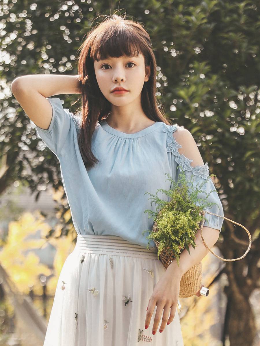 2019年夏季新款 蕾丝衣短款 雪纺圆领短袖 仙女露肩夏装 清爽套装