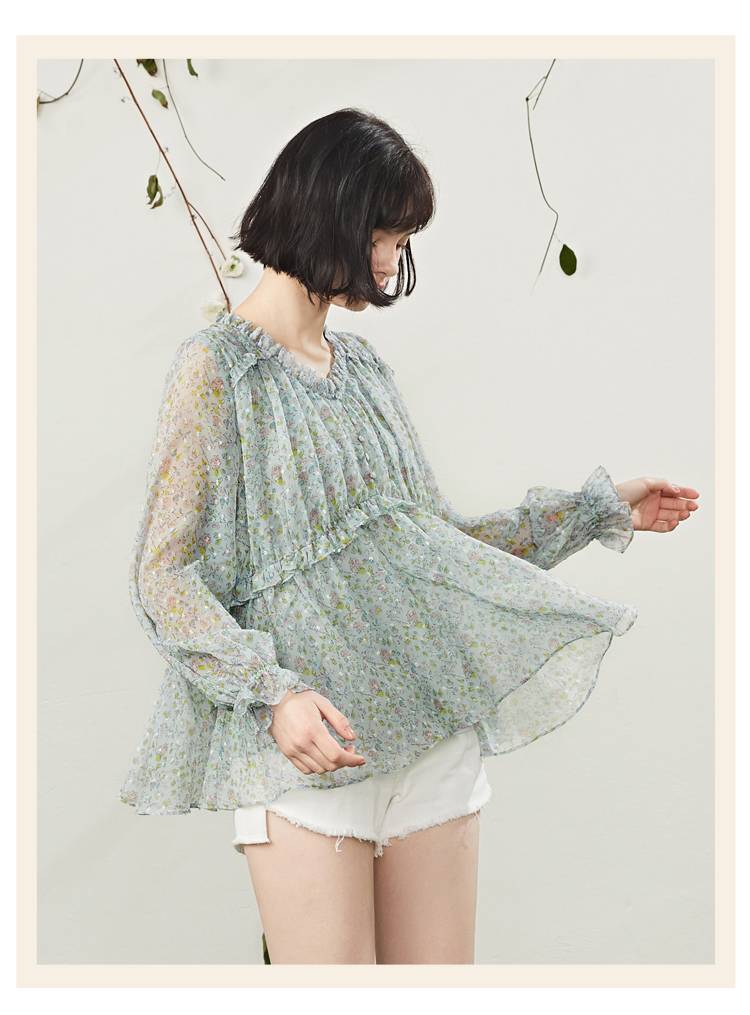 2019年夏季新款蕾丝衣短款高腰雪纺小个子V领长袖 仙女印花薄款衣