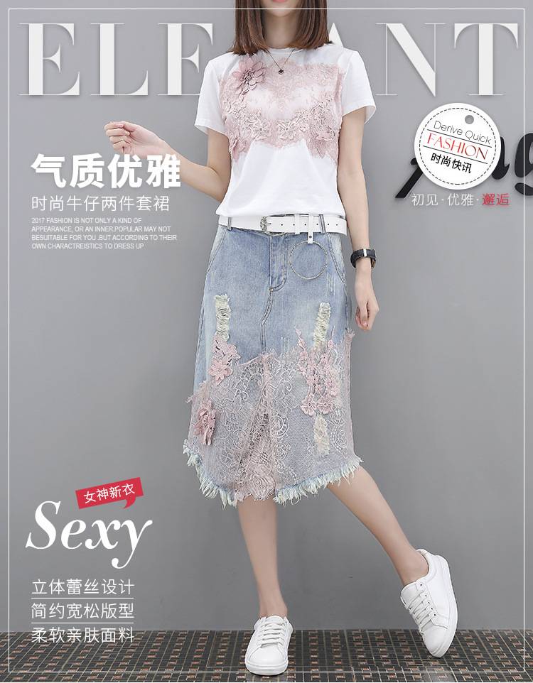 蕾丝上衣蕾丝牛仔裙 2019夏季新品A字裙中长款修身花边仙女套装裙