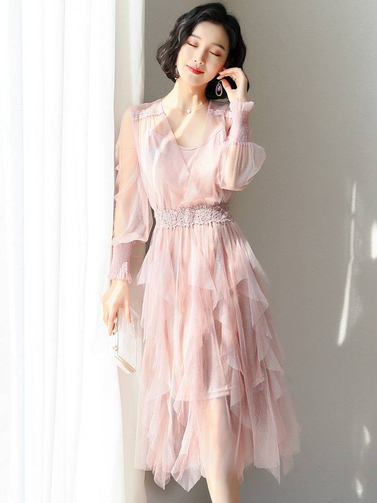 2019新款女装春装蕾丝裙子粉色很仙的法国小众连衣裙春秋