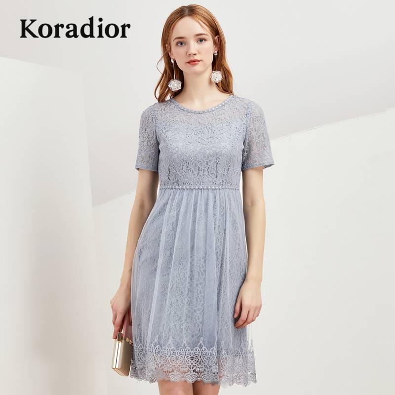 2019年夏季新款蕾丝裙中长款修身高腰雪纺裙小个子圆领短袖连衣裙