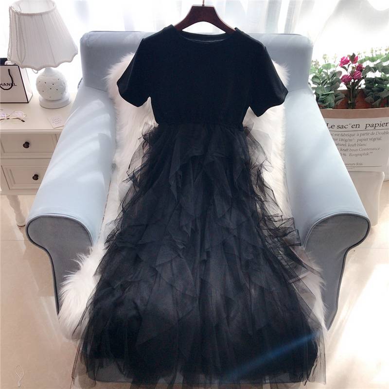 很仙的网纱拼接t恤连衣裙女2019春夏新款黑色蓬蓬蛋糕裙中长款