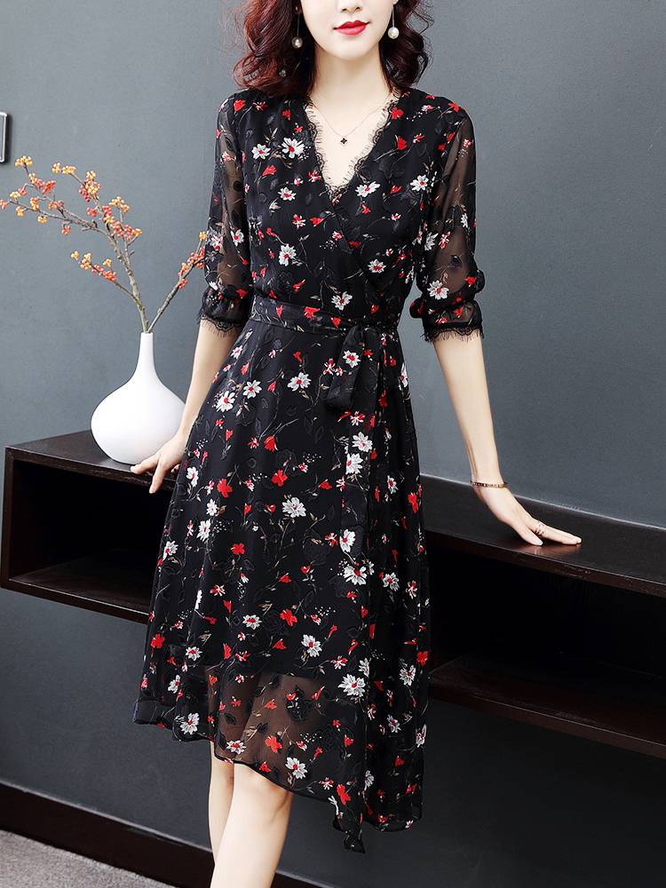 黑色碎花雪纺连衣裙女2019春夏装新款气质蕾丝v领印花收腰a字裙子