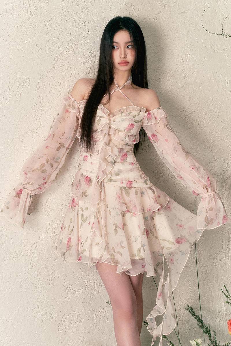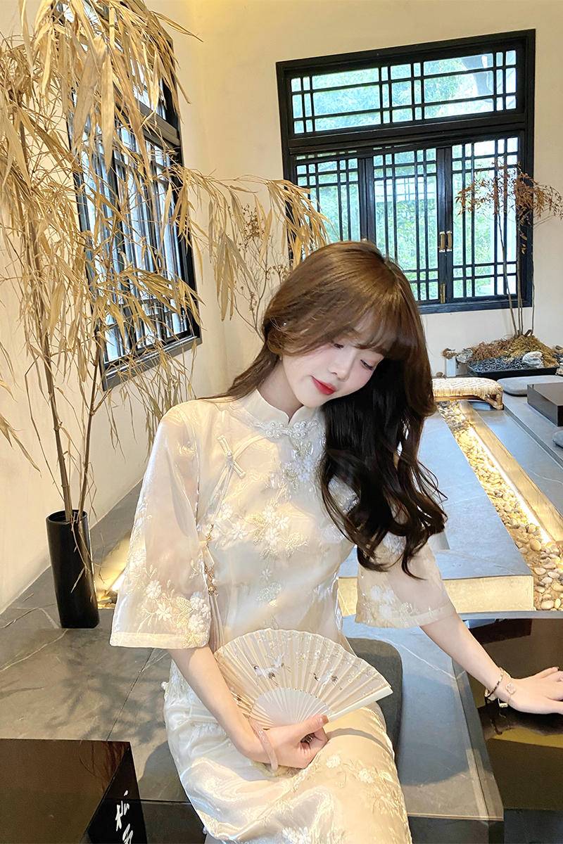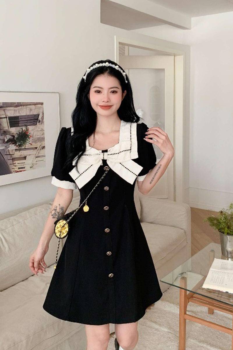 法国小众桔梗裙子女2025夏装新款气质V领单排扣雪纺短袖连衣裙女