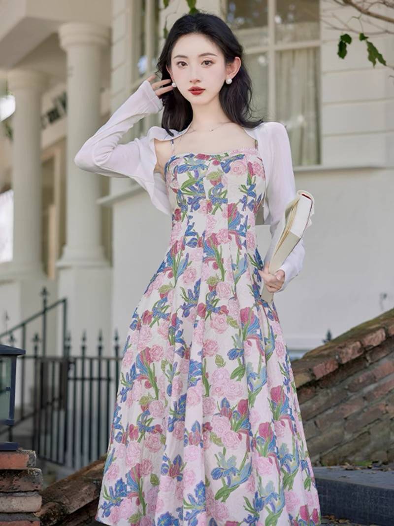 茶歇法式复古绝美油画碎花吊带气质连衣裙2024新款女夏高级感裙子