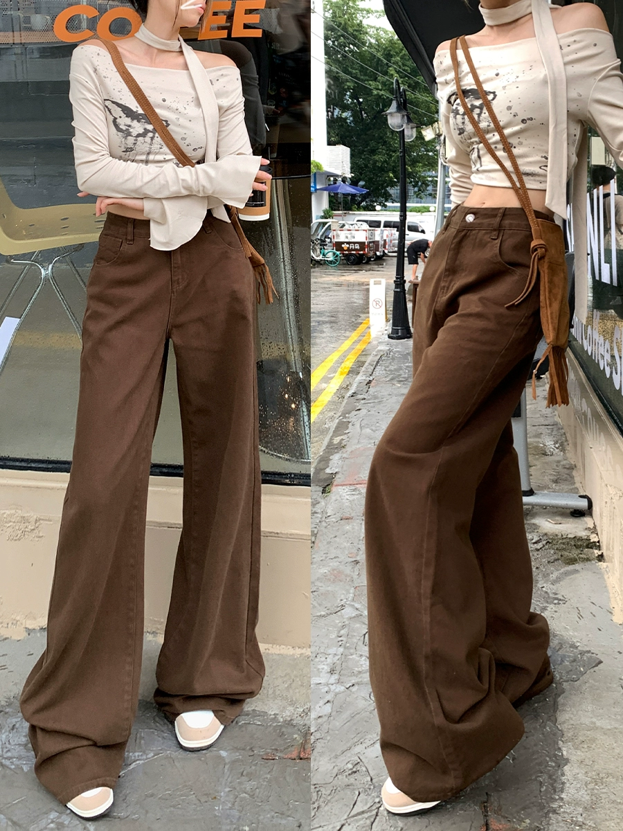 美式复古棕色加绒阔腿牛仔裤女高腰宽松显瘦咖色垂感直筒拖地裤子