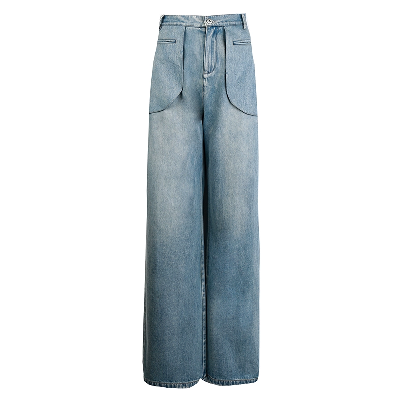 大口袋浅蓝色高腰直筒阔腿牛仔裤女拖地长裤设计感