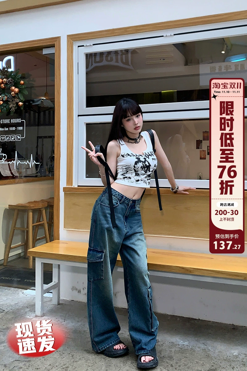 复古阔腿牛仔裤女秋季新款小个子口袋美式宽松拖地长裤