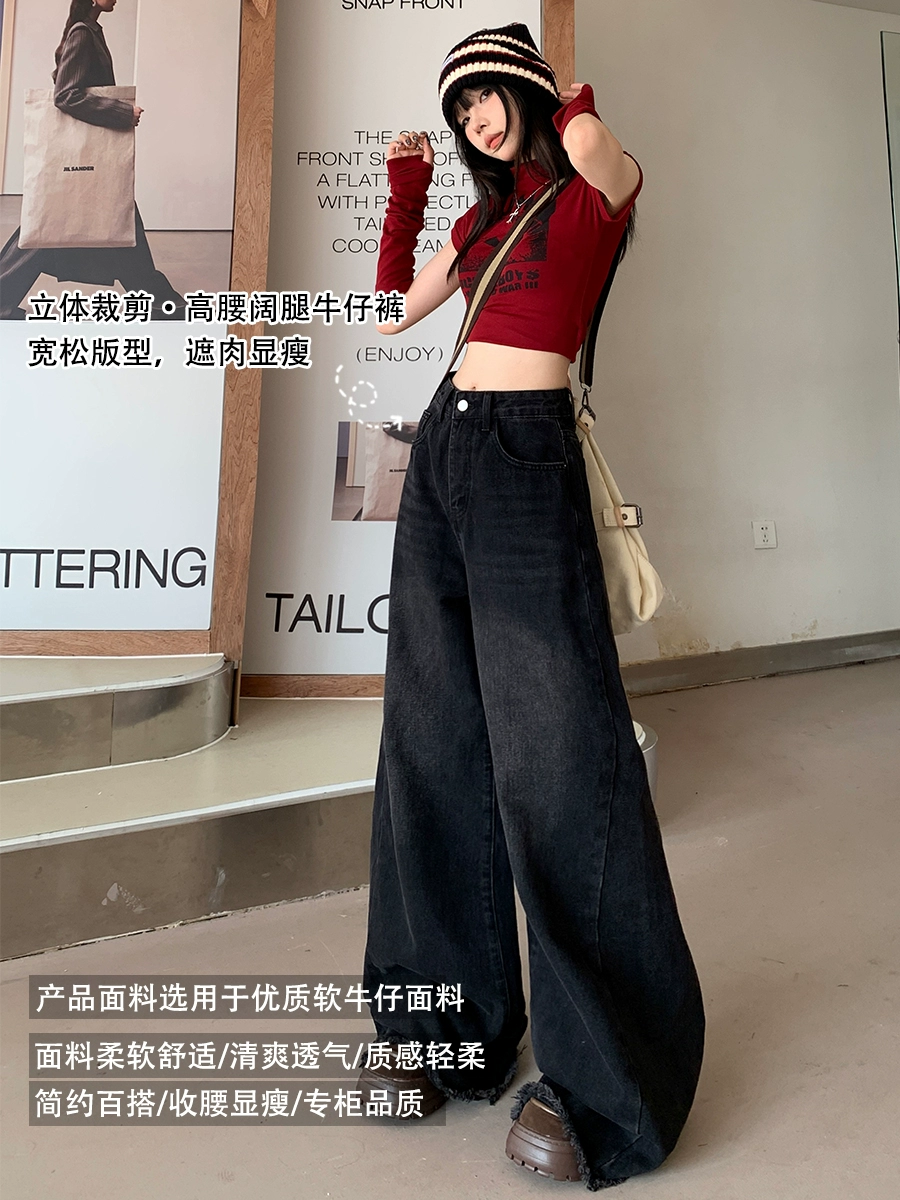 美式复古黑灰色宽松阔腿牛仔裤女秋冬高腰显瘦垂感拖地毛边喇叭裤