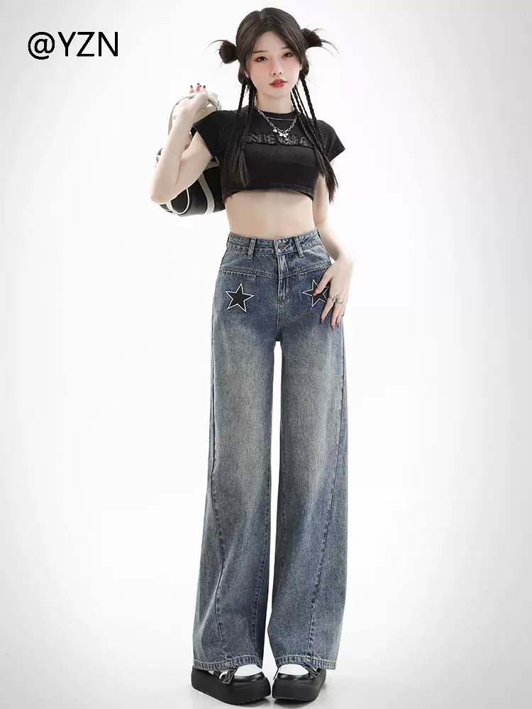 美式复古阔腿牛仔裤女秋季2023新款高腰显瘦宽松直筒梨形拖地裤子