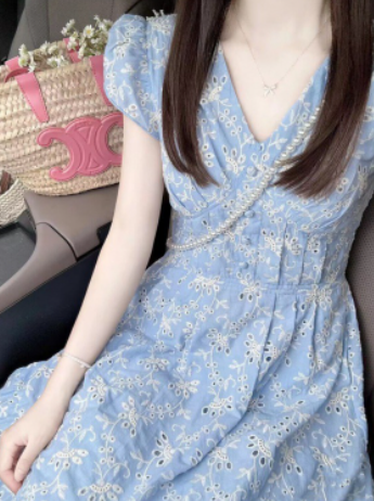 高级感重工刺绣蓝色桔梗法式连衣裙女夏季新款小个子收腰显瘦裙子 135.00 已售:1件