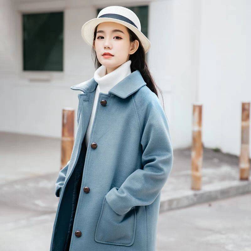 复古娃娃领新款雾蓝气质呢子大衣