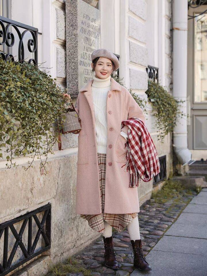 森系少女温柔风浅粉色中长款呢子大衣