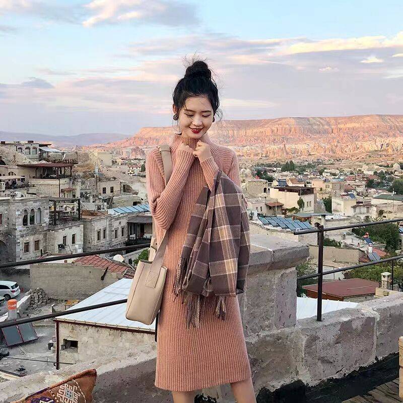 抹茶loves内搭针织连衣裙女过膝半高领中长款保暖毛衣
