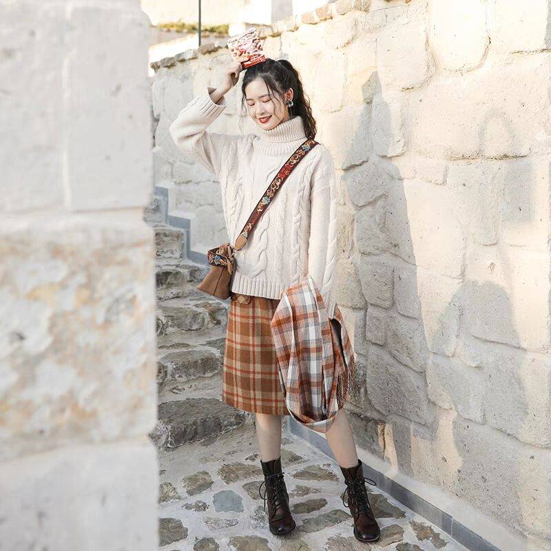 抹茶loves2018初冬新款文艺清新高领麻花针织复古套头毛衣