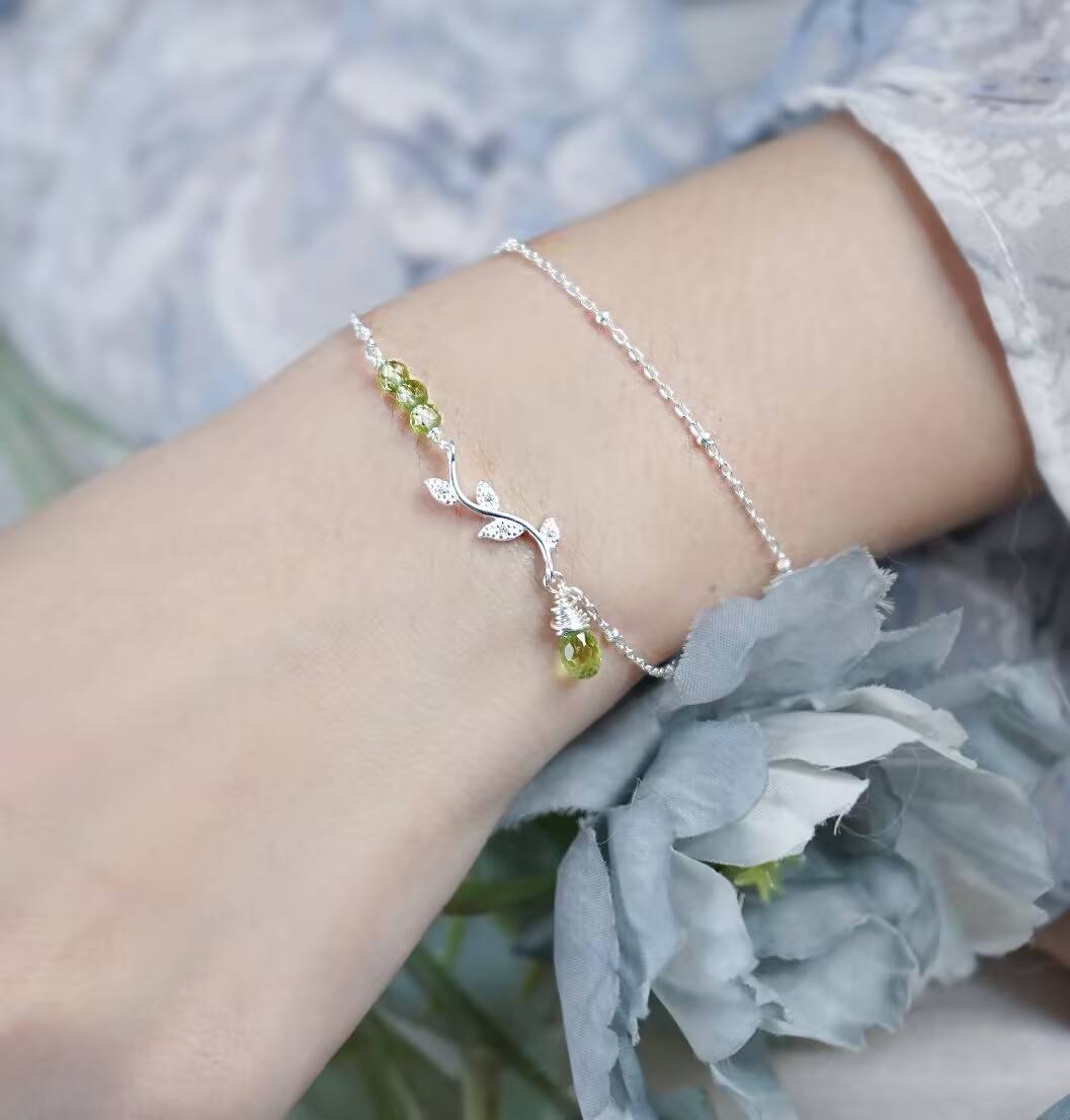 Honest青枝绿叶 原创设计天然橄榄绿石S925银双叠层手链气质仙气