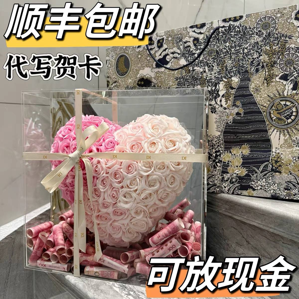 有钱花玫瑰镜面爱心永生花春节新年结婚告白送女朋友生日花束礼物