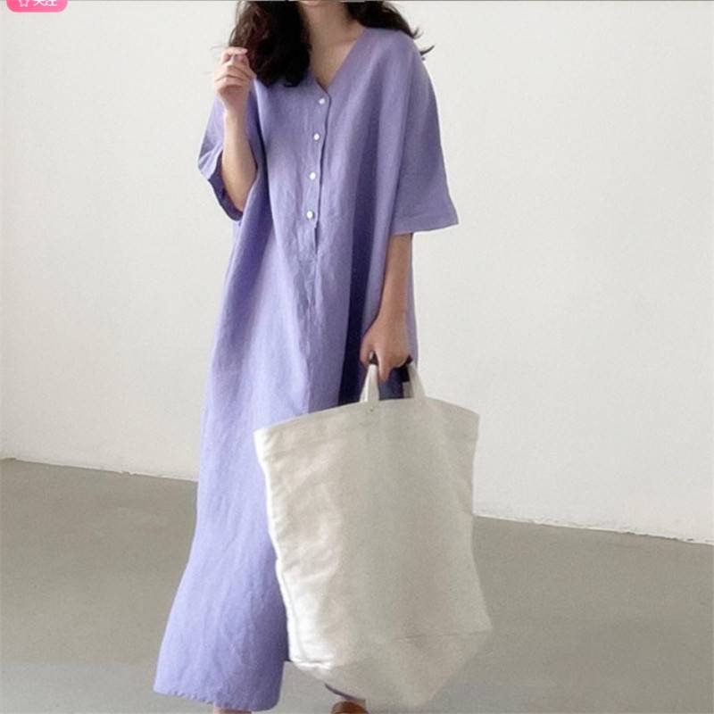 简约棉麻连衣裙2022夏季新款宽松短袖长款棉麻衬衫裙
