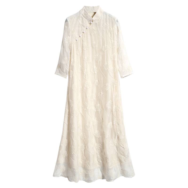 2022春夏新款复古文艺中长款连衣裙立领蕾丝国风文艺长裙女