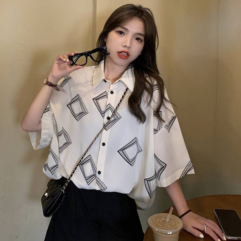 港风复古印花短袖衬衣2021夏季韩版学生ins休闲上衣女polo雪纺衫