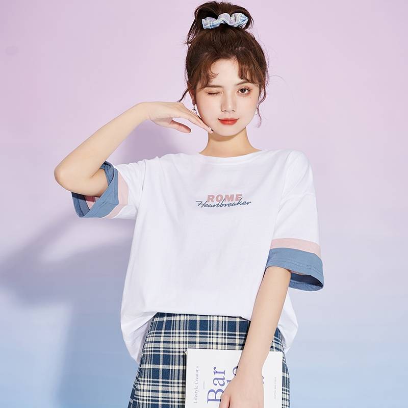 帛卡琪2021夏新款纯棉拼色短袖T恤女学生宽松字母印花上衣潮体恤