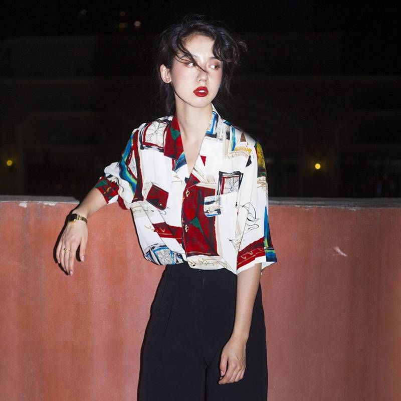 港味复古衬衫女设计感小众涂鸦印花短袖西装领宽松花衬衣女春夏季